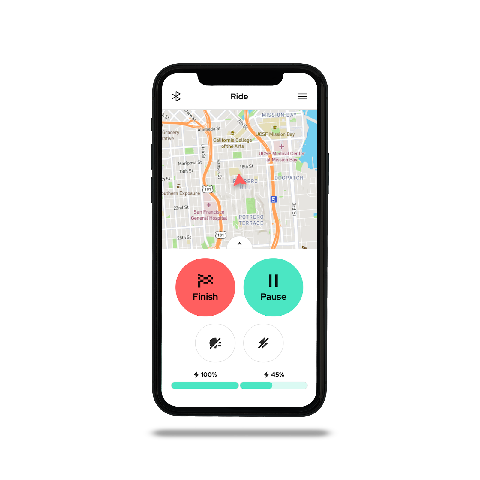 Im Ride-Modus zeigt dir die App in Echtzeit alle wichtigen Leistungsdaten, darunter Geschwindigkeit, Akkustand, Fahrzeit, Distanz, Kalorienverbrauch, Standort und mehr. So behältst du den Überblick und kannst jede Fahrt gezielt optimieren.