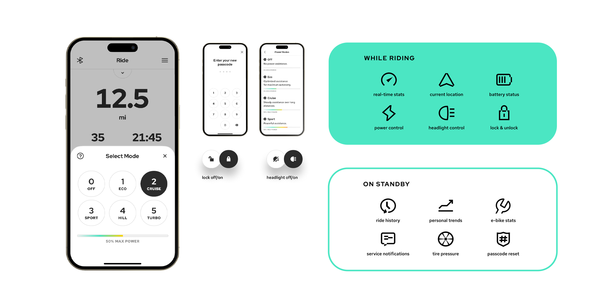 Benutzerfreundlich und leichtzubedienen: Die minimalistischeOberflächemit allen Funktionen auf einem Screen setzt auf Einfachheit und intuitive Steuerung, für einrundumverbessertes E-Bike-Erlebnis.Schalte das Licht ein, wählezwischen den Fahrmodi Eco, Cruise, Sport, Hill und Turbo, sperreoderentsperredein E-Bike oderändere den Konsolen-Pin allesdirektüberdein Smartphone.